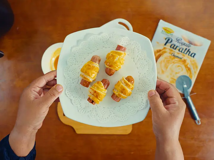 Crispy paratha-wrapped corndogs drizzled with sauce, offering sweet-savory bites perfect for picnics & celebrations.
